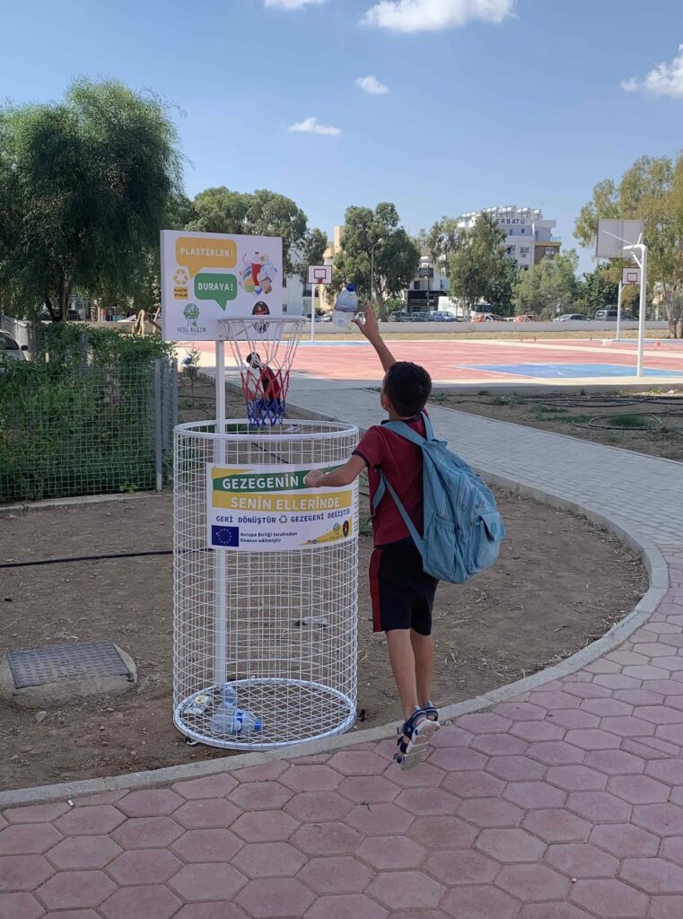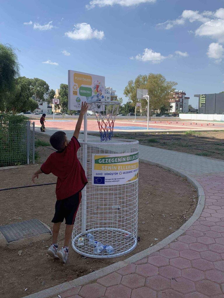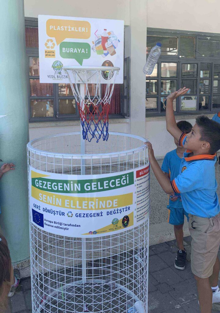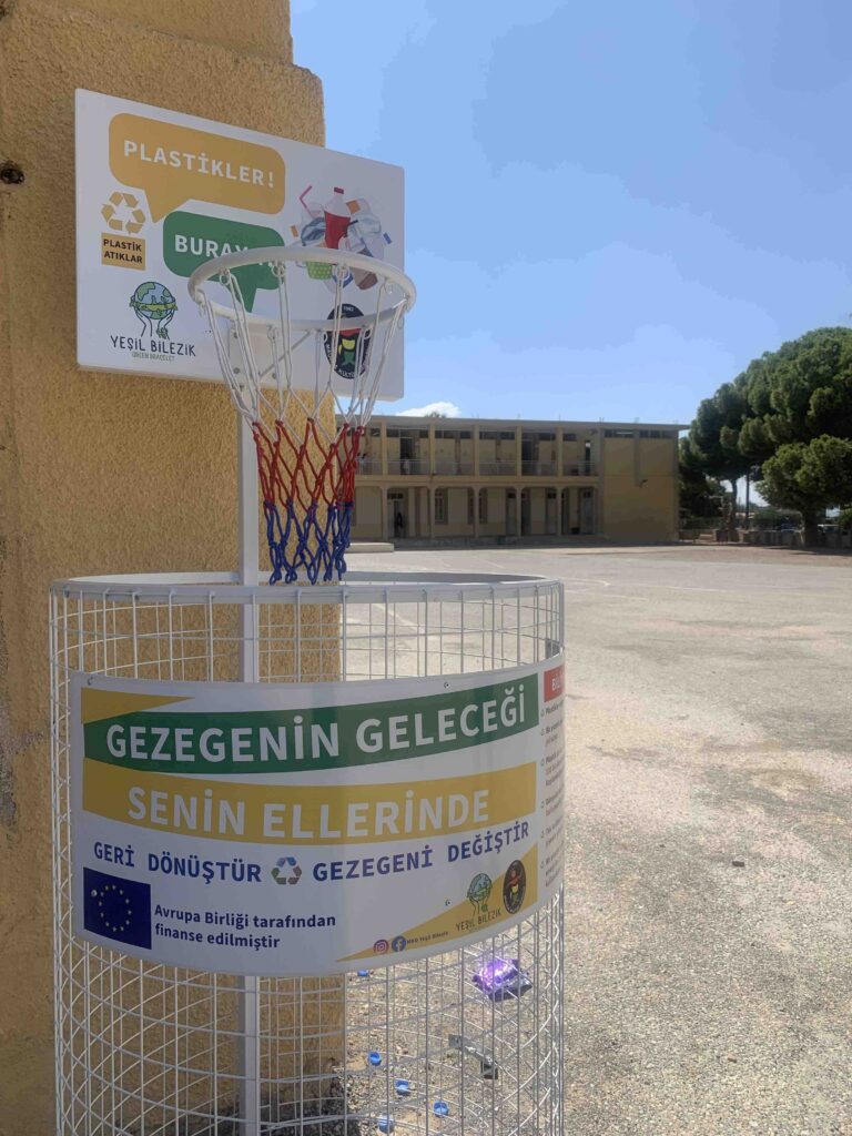 Avrupa Birliği tarafından Kıbrıslı Sivil Toplum İş Başında VII Hibe Programı kapsamında finanse edilen ve çevre okuryazarı bireyler yetişmesine katkıda bulunmayı hedefleyen Yeşil Bilezik: Sürdürülebilir Kalkınma için Çevre Okuryazarlığı Projesi kapsamında ilkokullara basket potası şeklinde atık ayrıştırma kutuları kazandırıldı. Atık yönetimi ve plastik atıklar konusunda farkındalık yaratmak ve davranış değişikliğini desteklemek için ilkokullara kazandırılan basket potası şeklindeki atık ayrıştırma kutuları öğrencilerin yoğun ilgisini görüyor. Öğrenciler, başta atık pet şişeler olmak üzere çeşitli plastik atıkları basket potası entegresi ile üretilmiş olan plastik toplama kutularına atıyor. Birçok öğrenci okul dışından da pet şişe toplayarak kampanyaya destek veriyor. Çocukların geri dönüştürmeyi ve atık ayrıştırmayı eğlenerek benimsemelerini sağlamak amacıyla geliştirilen kutular Mağusa’da faaliyet gösteren 7 ilkokulun bahçesine yerleştirildi.